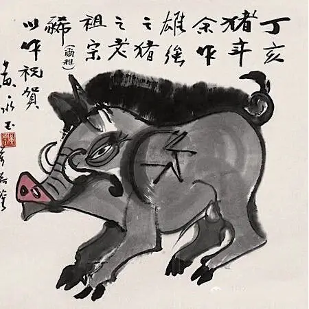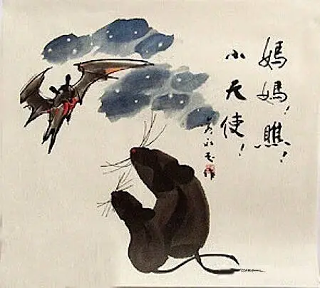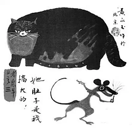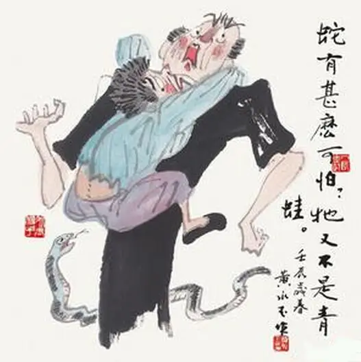 他还画过一个蛇年趣图。没有蛇,只有两个没有肚脐眼儿的光屁股洋人在苹果树下对话。蛇上哪儿了?